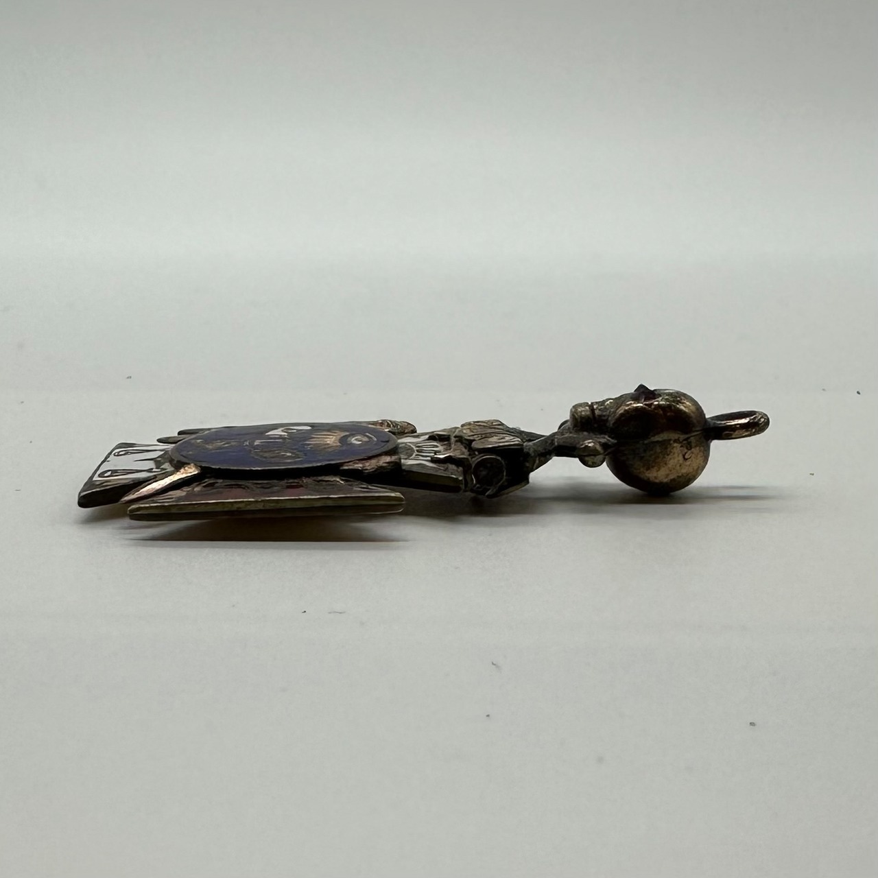 1910年代くらいの懐中時計に取り付けるチェーンのチャームです。オッドフェローズという結社のモチーフ。当時のSEARSのカタログでも見られるアイテムです。日本で言うところの根付のようなもの。ペンダントヘッドにしても良いと思います。